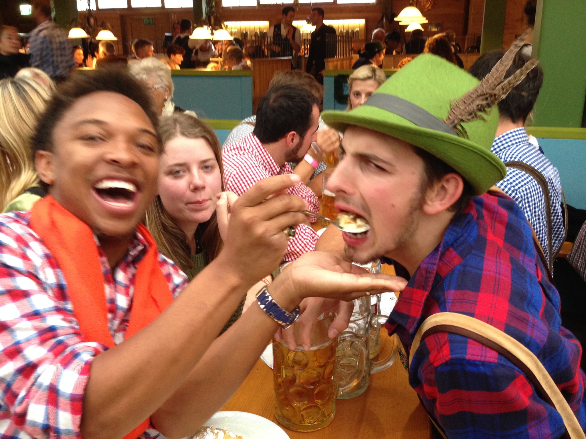 We went to bed pretty early because the famed Oktoberfest was the next day. We were told we needed to get there pretty early in order to get into the tent because they fill up pretty quickly, but waking up isn’t as easy as you think when you actually have a comfortable bed. We set the first alarm for 6, then after a little discussion we set it for seven, then 8, and we finally convinced ourselves at 9 we would get up and start getting ready. We actually didn’t leave the house until a little after 11. We made a couple sandwiches and hit the road. The train ride there was pretty easy two hour straight shot and free with the eurail. After arriving in Munich at about 2 we had no idea where to go we figured we would just follow the people in lederhosen. While following the crowd we ran into our two new favorite Aussies Dominique and Stuart.